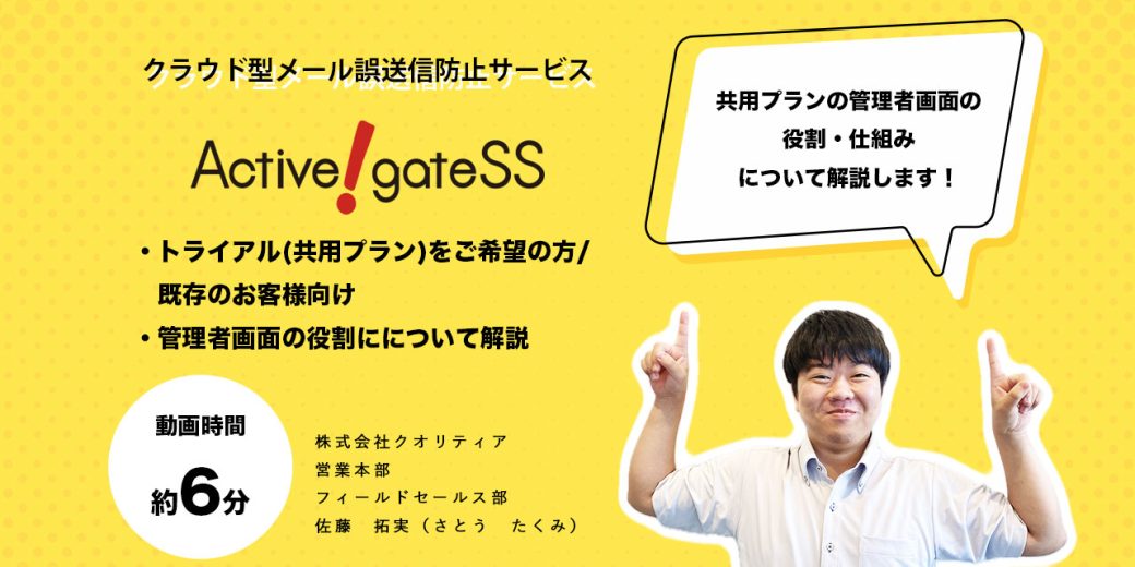 弊社 営業本部 フィールドセールス部 佐藤 拓実(通称:たくちゃん)によるクラウド型メール誤送信防止サービス「Active! gate SS」の「共用プラン」の管理者画面について解説について解説する動画となっております。