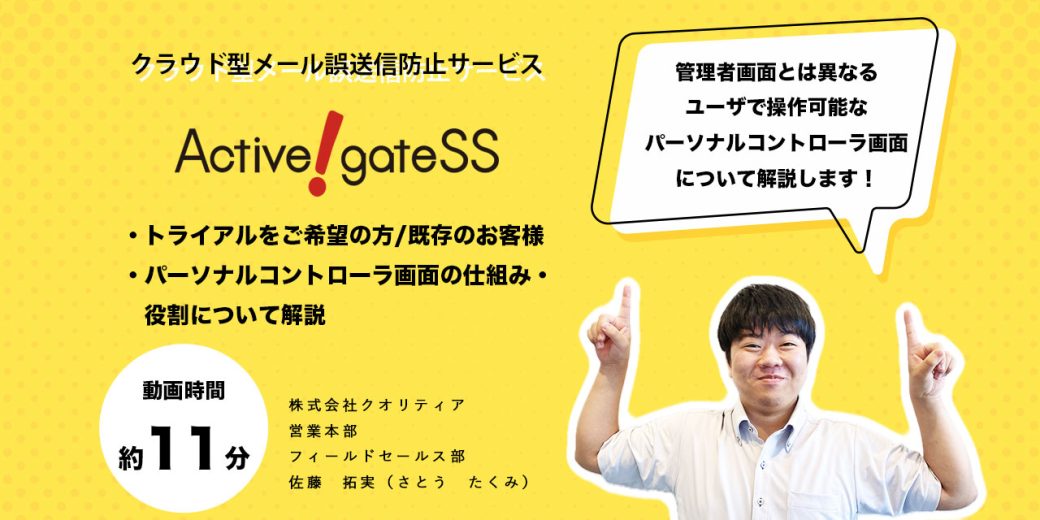 弊社 営業本部 フィールドセールス部 佐藤 拓実(通称:たくちゃん)によるクラウド型メール誤送信防止サービス「Active! gate SS」のパーソナルコントローラ画面について解説について解説する動画となっております。